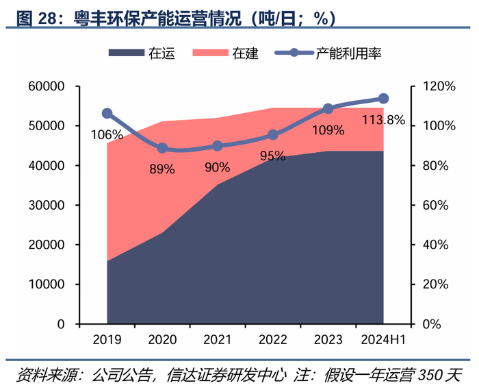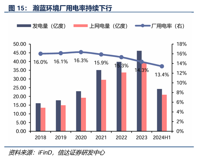 通过降低厂用电率&拓展供热,积极提升运营管理效率。为了应对国补退坡的挑战,公司提高运营效率,开拓供热业务。(1)降本增效。厂用电率持续下降,从2018年16%下降到2024H1的13.4%;同时,产能利用率不断提高,从2021年97%提升至2024H1超过120%;(2)发展热电联产业务增加供热销售收入。公司利用垃圾焚烧发电项目的热源和区位优势,开拓管道供热和长距离移动供热项目,供热量自2021年以来持续增长。