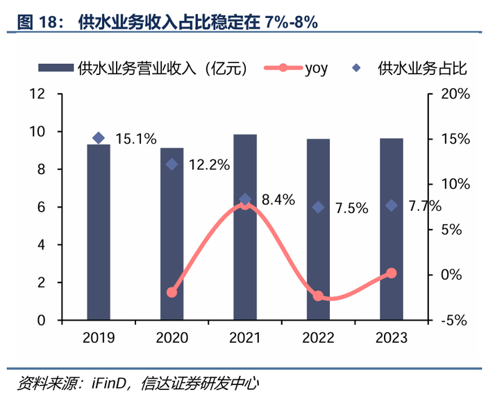 公司在南海区供水市场具有垄断地位。公司运营第二水厂、新桂城水厂、九江水厂、西江水厂,日均供水能力达到169.6万立方米,在南海区水务市场覆盖率超过90%。2021-2023年,板块收入贡献占比整体稳定在7%-8%之间。售水量保持稳定,2019-2023年复合增长率为1%。
