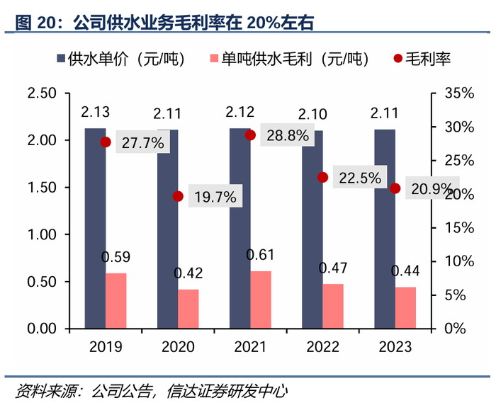 受到供水成本提升影响,毛利率小幅下滑。2022年受到有效需求不足影响,南海区售水量及售水单价均有所下滑,但电费、药剂费、维修费等仍有上涨,因此毛利率略有下滑,2023年公司供水业务毛利率保持在20%。