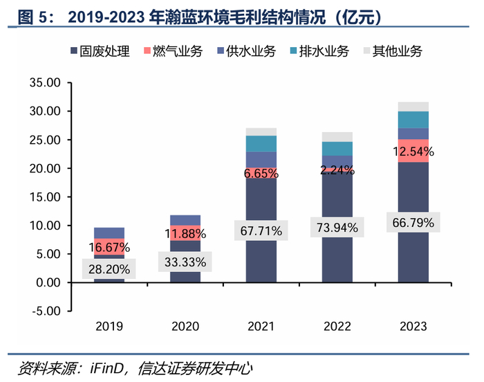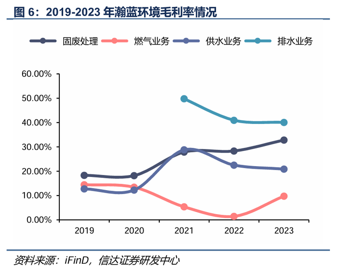 降本增效助力固废主业盈利能力上行,能源、水务业务盈利回归稳定。固废业务:2023年毛利占比超过65%,为公司盈利增长的主要支撑。伴随毛利率较低的固废工程业务缩量及降本增效推进,板块毛利率持续抬升。排水业务:2023年毛利占比保持在10%左右,2021年以来毛利率略有下滑,但仍保持40%以上,处于行业较好水平;能源业务:2023年毛利占比为12.5%,2022年由于国际能源价格上涨,板块业务盈利受限,2023年经营好转,毛利率回升至10%;供水业务:2023年毛利占比为6.4%,毛利率稳定在20%左右。