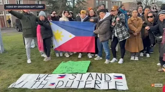 现场视频显示,在杜特尔特抵达前,海牙拘留中心外已经聚集了大批杜特尔特支持者。这些支持者手举菲律宾国旗和“我们支持杜特尔特”的标语,并高喊“释放杜特尔特”。