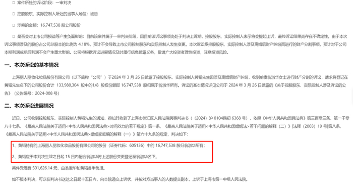 2024年12月31日丽人丽妆发布公告称,公司控股股东、实际控制人黄韬与其前妻翁淑华的离婚财产分割案一审结果正式公布。