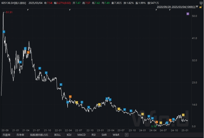 至2024年7月,其股价最低跌至5.09元,较历史高点缩水约90%,市值仅剩23亿元,甚至跌破发行价(按分红除权后计算)。截至今年3月12日,市值虽然随9.24行情之后有所回升,但也不过是30.39亿元。