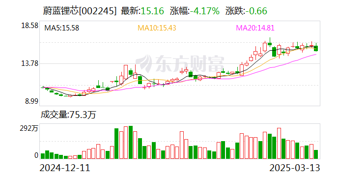AI点评:蔚蓝锂芯近一个月获得4份券商研报关注,买入3家,平均目标价为19.25元,与最新价15.51元相比,高3.74元,目标均价涨幅24.11%。