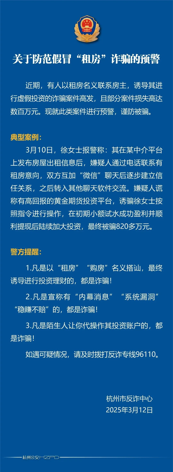 3月12日,杭州警方发布紧急预警:近期,有人以租房名义联系房主,诱导对方进行虚假投资的诈骗案件高发,且部分案件损失高达数百万。