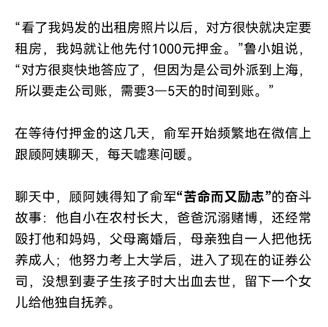 “她希望尽快租出去,就在好几家房产中介挂了租房信息,毕竟空关一天就少一天的租金。”女儿鲁小姐回忆,7月27日,顾阿姨接到一个租房电话,对方自称是某大型证券公司数据中心的技术总监,叫俞军,想要租房。