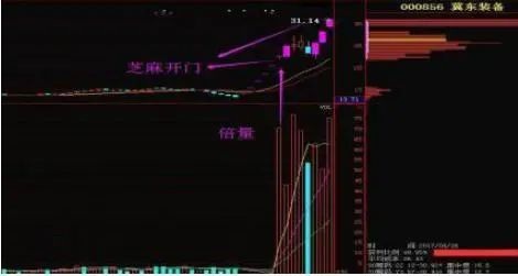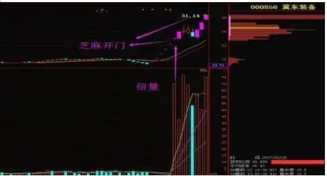 股市里的芝麻开门,是指股价在重大利好(定向增发、资产置换、整体上市)刺激之下,直接连续空心涨停,而当股价一般出现连续三个空心涨停之后,出现打开涨停的时候,此时则是还未进场投资者的最后买入机会,当天股价往往还会继续出现涨停板,K线形态为T字型涨停。而此后还有巨大上升空间,而这次涨停板如同阿巴巴和四十大盗童话里的那扇财富大门,因此称为芝麻开门涨停战法。