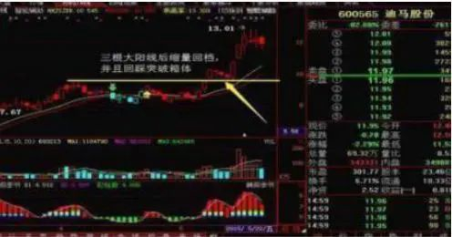 如图:迪马股份在5月7日—5月11日三个交易日期间,连续收了3根大阳线,虽然没有出现涨停,但也是短线强势启动,并且突破了前期高位横盘一个月多点的箱 体顶点,然后缩量回调了3天,开始连续涨停发力,短短几个交易日之内,涨幅就超过了20%。他的核心逻辑就是上升回档的缩量回档与 传统技术图形的突破回踩出现了重叠,因此二者综合发力,短线爆发非常强。