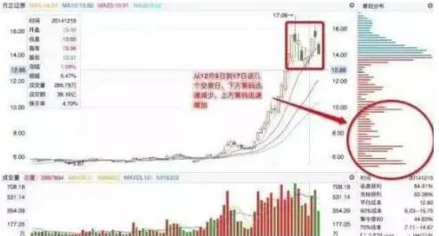如图所示,可以看到:在股价的拉升过程中,集中在6元附近这块区域的筹码大部分锁定未动,只有少许筹码向上转移了,这也就意味着,在股价从6元向17元拉升的过程中,主力并未打算出货。