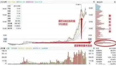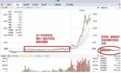 如图所示,为方正证券前期的吸筹工作,时长近一年半,筹码集中收集区域在6元左右。这个区域,也就是主力吸筹的大体成本。