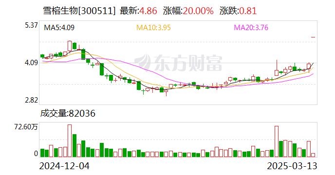 3月13日,上海雪榕生物科技股份有限公司迎来股票复牌,公司开盘“20cm”涨停,截至记者发稿,报4.86元/股,总市值为24.24亿元。