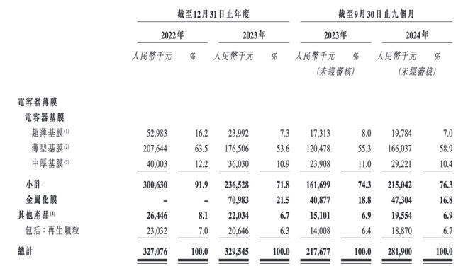 其中,电容器基膜是薄膜电容器的电介质,直接决定了薄膜电容器的性能,2022年、2023年及2024年前三季度(以下简称"报告期内"),电容器基膜的收入分别为3.01亿元、2.37亿元和2.15亿元,占其各期总收入的比例为91.9%、71.8%、76.3%。