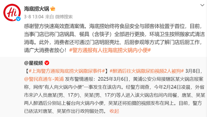3月12日,海底捞官方微博发布《关于海底捞上海外滩店事件的说明》,声明中称,2025年2月24日凌晨,两名男子在海底捞上海外滩店包间用餐后在火锅锅底中小便。该说明一经发布迅速冲上热搜,引发网友广泛关注。