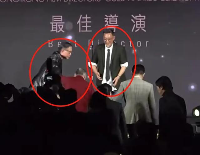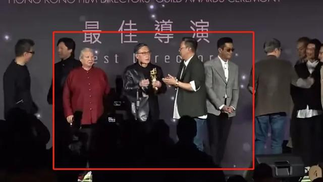 不仅如此,还有一个细节值得玩味。主持人早早地向洪金宝伸出援手,导演郑保瑞也有上前搀扶的意图,不过看到古天乐已经在搀扶洪金宝后便作罢。此时,众人脸上都带着讨好般的笑容,洪金宝的身份地位不言而喻。登上舞台后,洪金宝和古天乐最初站在C位的两侧,舞台中央是主持人和导演郑保瑞。起初,他们二人并未打算站C位,但在主持人的热情邀请下,最终还是被拉到了中间,紧挨着导演郑保瑞,这样的站位充分彰显了他们在导演们心中的咖位,远超其他人。