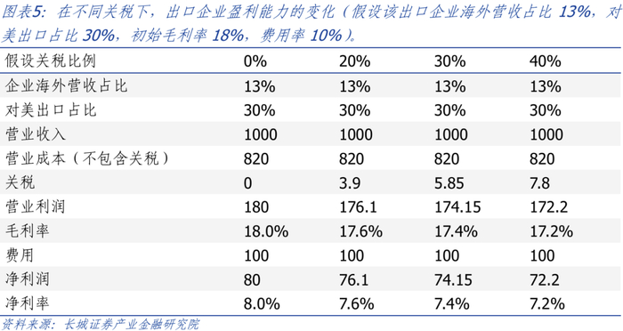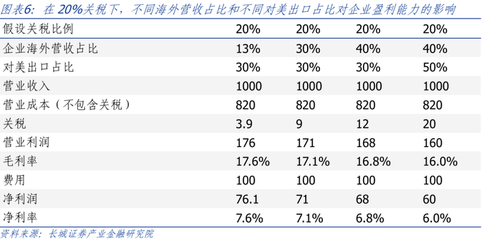 在假定20%的关税下,不同出口程度的企业受影响程度不同。当企业海外营收占比从13%提升至30%,对美出口占比维持30%,企业净利率下降0.5%;当企业海外营收占比继续提升至40%,企业净利率进一步下滑0.3%;当企业海外营收占比维持40%,但对美收入占比从30%提升至50%,企业净利率下滑0.8%。