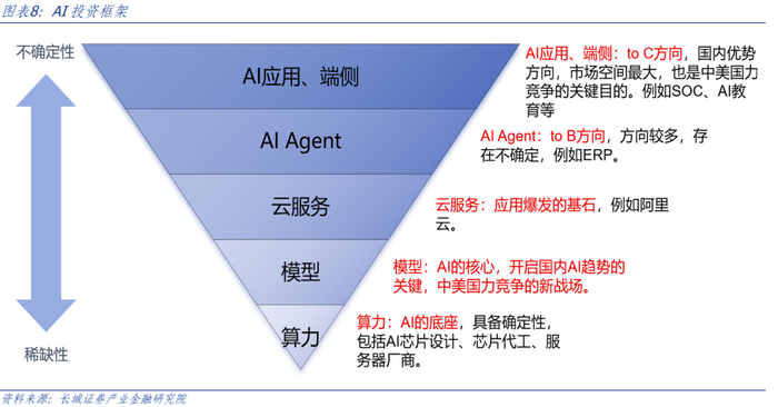 投资建议:把握国内AI产业趋势,中期聚焦算力,长期聚焦应用。按方向分,AI可分成算力、云服务、AI Agent、AI应用和端侧,算力和云服务在产业趋势中具备较强的确定性,AI Agent、AI应用具备较强的不确定性。参考美国股市的AI叙事,行情顺序从算力基础设施,到AI赋能者,再到AI Agent和AI应用,其中算力基础设施的行情持续时间长且涨幅较高;目前我国AI产业趋势相较美国仍处于前期阶段,前期阶段或更注重算力和云服务。算力,AI的底座,具备确定性,包括AI芯片设计、芯片代工、HBM,其中AI芯片设计、芯片代工在国内还具备稀缺性,是AI产业趋势往后推荐的堵点和关键。