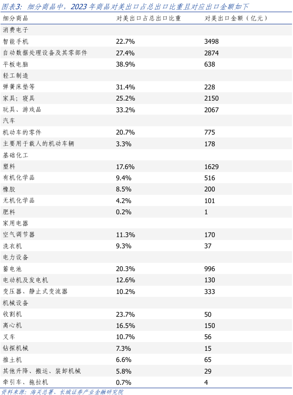 对美敞口:对美敞口较大的行业包括消费电子(2023年对美出口占总出口比例:智能手机23%、自动数据处理设备及其零部件(电脑等)27%,下同)、轻工制造(玩具游戏品33%、家具寝具25%)、汽车零部件(机动车的零件21%)、基础化工(塑料18%)、电力设备(蓄电池20%、电动机及发动机13%)。对美敞口的衡量运用行业海外营收占比和商品对美出口占比,行业的海外营收占比高且行业内的出口代表商品对美出口占比高,该行业对美敞口较大。中美关系变化,对美出口占比高的行业或受影响。