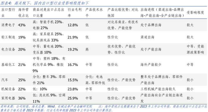 综合分析下,在高关税下,消费电子、轻工制造受影响程度较大,而汽车、机械设备、家用电器受影响程度相对较小。消费电子由于对美敞口高、毛利率较低、产能主要集中在国内,行业易受高关税的影响,例如消费电子产品中的电脑产业链,27%的国内出口的电脑主要面向美国市场,国内企业集中于代工和组装环节,毛利率较低,且在美产能较少,受关税的潜在影响较大。