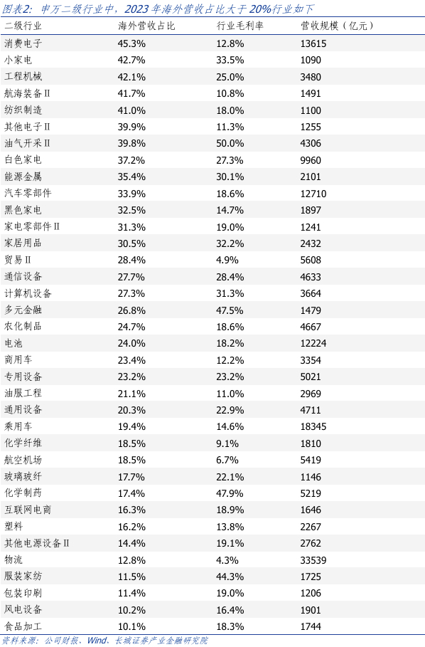 微观层面,关税对出口企业的影响在于侵蚀盈利能力,影响企业净利率。无论是哪种国际贸易模式,FOB或DDP,在征收关税的情况下,对出口企业的影响主要集中在毛利率和净利率上,对企业的盈利能力造成消极影响。根据测算,2023年全A非金融,海外营收占比13%,假设其中对美出口占比30%,在20%关税下,双方各自承担一半,将下调企业净利率0.4%。假设关税从20%上调至30%、40%,相比20%关税下,企业净利率将下降0.2%、0.4%。
