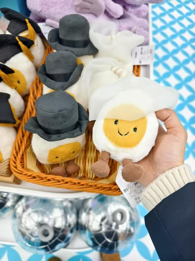一个不到手掌大的“新郎水煮蛋”毛绒玩偶售价225元,如果再买一只“新娘水煮蛋”凑成一对,就要460元。别看很多Jellycat的毛绒玩偶小小的、萌萌的,价格却很“辣手”,被称为“玩偶界爱马仕”。即便如此,热门款式经常一到货就被抢购一空。在瑞虹天地太阳宫的Jellycat授权店,店员告诉记者,该店已经建立了15个“到货通知”的微信群,加起来有五六千人,其中不乏四五十岁的中年人。