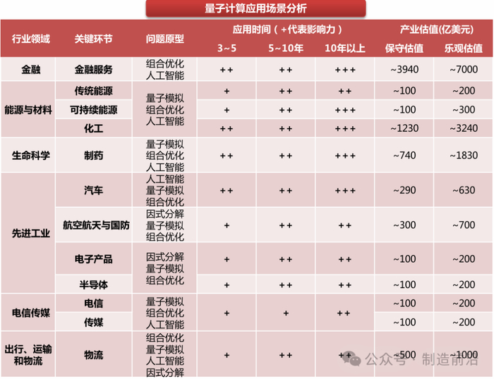 量子计算应用领域涵盖化学、金融、人工智能、交运航空、气象等众多领域,产业规模达干亿美元级别。