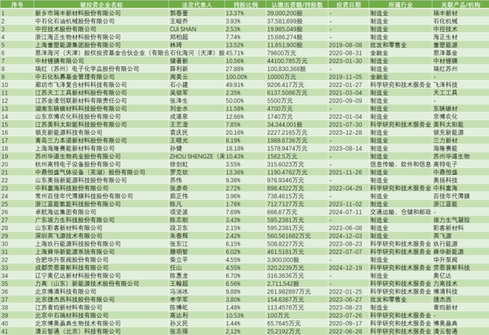 企查查显示,中石化资本共发生41起对外投资,其中,新能源与新材料领域投资占比已达总投资的70%,涵盖动力电池材料、电子化学品等15个细分领域。