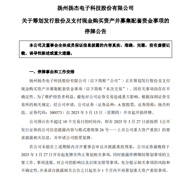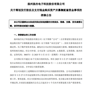 受此影响,该公司股票自当日开市起停牌,预计3月27日前披露重组预案并申请复牌。这一动作标志着扬杰科技在功率半导体领域的战略布局进入关键阶段,有望通过产业整合强化技术协同与市场竞争力。