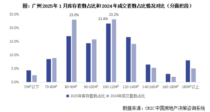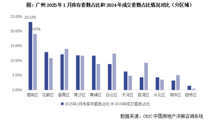 记者注意到,在一线城市中,广州楼市短期内仍面临一定的去库存压力。据克而瑞数据,截至今年1月末,广州狭义库存去化周期超过20个月,库存主力面积段为100—120平方米,占比为21.64%。具体来看,增城区以23.12%的库存占比位居榜首,花都区和番禺区分列第二和第三位。