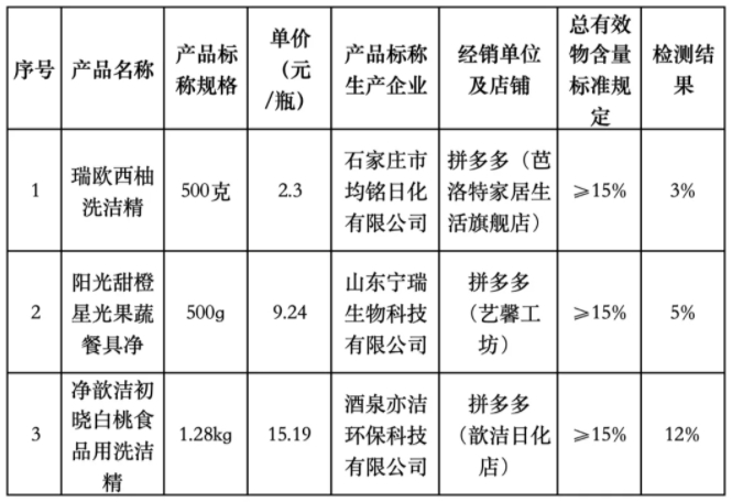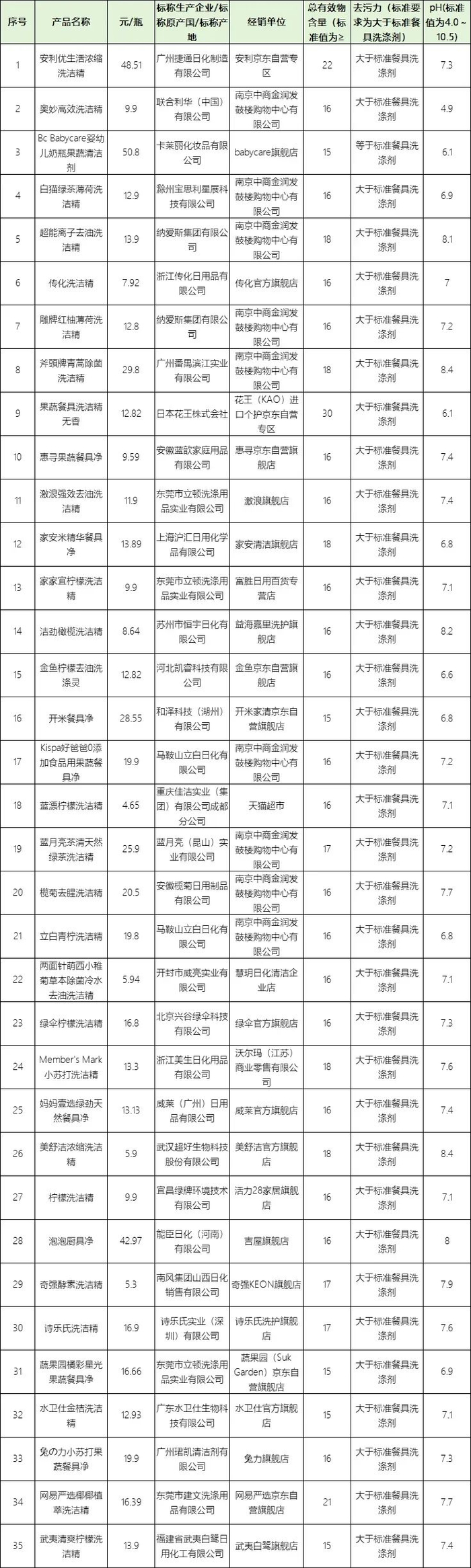 此外,标称产品名称为“Frosch柠檬浓缩餐具洗洁液”为进口产品,无明示标准,检测结果为10%,不做判定;“康威龙健康洗洁精”执行的是企业标准,企标要求总活性物≥10%,检测结果为14%,未判定不符合标准。
