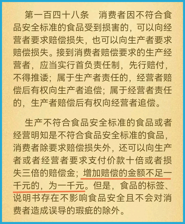 记者查询到,根据《中华人民共和国食品安全法》第148条,消费者因不符合食品安全标准的食品受到损害的,可以向经营者要求赔偿损失,也可以向生产者要求赔偿损失。此外,生产不符合食品安全标准的食品或者经营明知是不符合食品安全标准的食品,消费者除要求赔偿损失外,还可以向生产者或者经营者要求支付价款十倍或者损失三倍的赔偿金;增加赔偿的金额不足一千元的,为一千元。但是,食品的标签、说明书存在不影响食品安全且不会对消费者造成误导的瑕疵的除外。