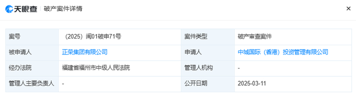 3月12日,天眼查法律诉讼信息显示,近日,正荣集团有限公司新增一则破产审查案件,申请人为中城国际(香港)投资管理有限公司,经办法院为福建省福州市中级人民法院。