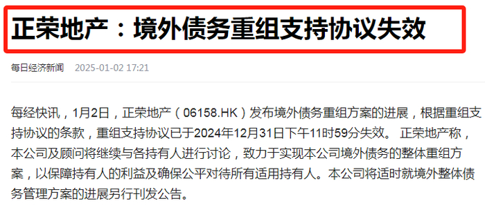 今年1月3日,正荣地产宣布境外债务重组支持协议失效,并称将继续与公司各持份者进行讨论,致力实现公司境外债务的整体重组方案,以保障持份者的利益及确保公平对待所有适用债权人。