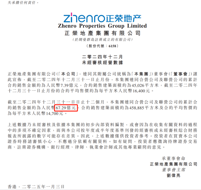 2018年,正荣地产正式跻身千亿房企阵营,但2024年合约销售金额只剩下67.29亿元,同比大跌56.26%。