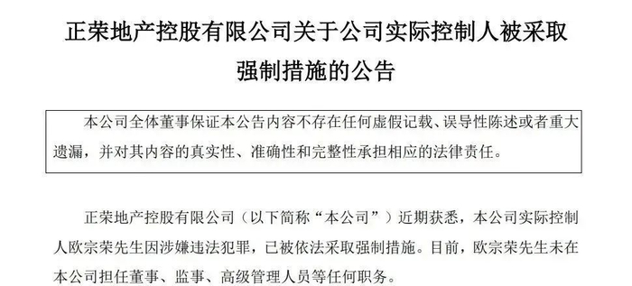 1月20日,正荣地产控股有限公司发布公告称,“近期获悉公司实际控制人欧宗荣先生因涉嫌违法犯罪,已被依法采取强制措施。目前,欧宗荣先生未在本公司担任董事、监事、高级管理人员等任何职务。”