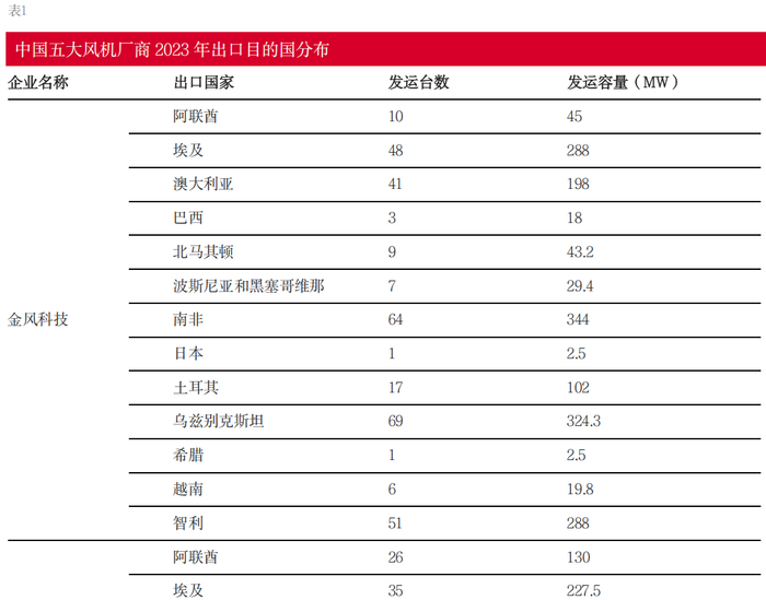 在过去几年里中国风机产品的出口重心持续南迁,中国企业对美国以及其他西方市场整体的依赖程度低。据中国风能协会(CWEA)数据显示,2023年中国风电设备出口的主要目的地包括乌兹别克斯坦、埃及、南非、老挝和智利,这些国家占据了中国风电出口总量的65%以上。