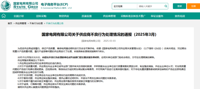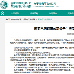 近日,国家电网电子商务平台发布关于供应商不良行为处理情况的通报,对近期出现重大产品质量问题、履约不诚信等问题的供应商进行了处理。