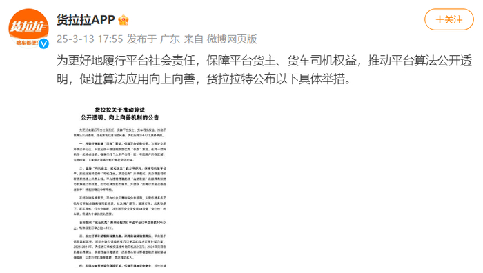 3月13日,货拉拉APP官方发文:为更好地履行平台社会责任,保障平台货主、货车司机权益,推动平台算法公开透明,促进算法应用向上向善,货拉拉特公布以下具体举措。