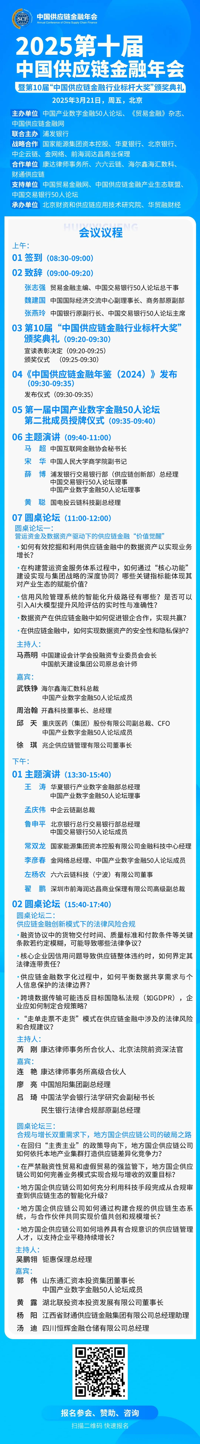 【第十届中国供应链金融年会】这场定于2025年3月21日在北京盛大启幕的年会,不仅是对过往成就的回顾,更是对未来趋势的展望。超过20位来自政府高层、行业领军专家、金融机构领袖及科技企业精英的重量级嘉宾,将携带着对供应链金融行业数字化转型的深刻洞察与实战经验,共聚一堂,分享智慧,启迪未来。