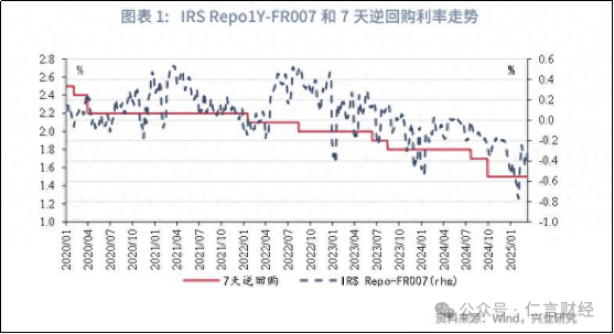 正好,兴业研究就做了一个方法,就是通过比较不同利率品种测算市场降息预期,即选取IRS Repo和FR007的利差作为后续定期跟踪市场降息预期的工具,理由是该指标反映了对于未来一年资金面松紧(FR007中枢)的预期,间接反映对于政策利率的预期。(大家对这个理论感兴趣的的可以自行deepseek一下)