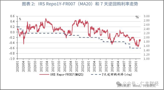 那经过兴业研究的测算呢,2025年以来,市场对于降息预期进行了修正,IRS Repo-FR007的倒挂幅度一度从2024年末的30-40bp走阔至50bp左右,近期已经修正至30bp左右。