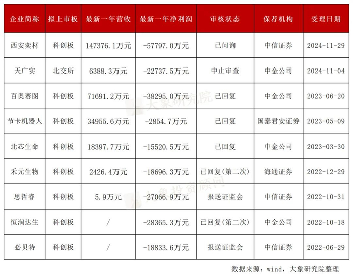 在这些利好政策的激励下,资本市场上排队的未盈利企业备受瞩目。截至目前,提交上市申请并处于在审排队阶段的仅剩9家未盈利企业,这9家企业中,有2家处于提交注册仍未获批的阶段,1家处于中止审查状态,其余处于已问询/已回复状态。具体情况如下:
