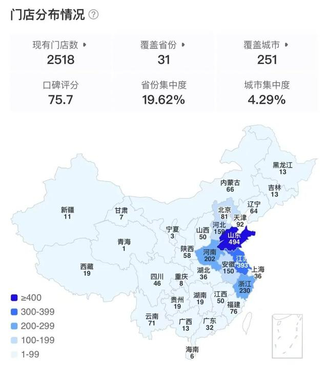 据窄门餐眼数据,截至2025年3月10日,杨铭宇黄焖鸡在全国范围内共有2518家门店,数量仅次于杨铭宇总部所在的山东。