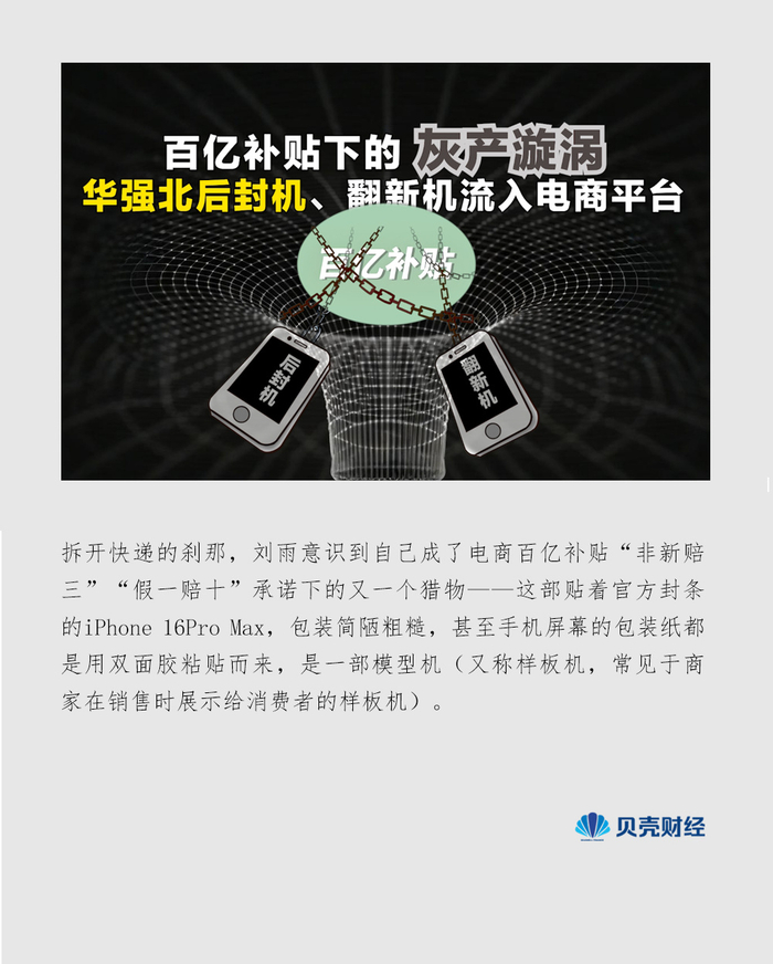 拆开快递的刹那,刘雨意识到自己成了电商百亿补贴“非新赔三”“假一赔十”承诺下的又一个猎物——这部贴着官方封条的iPhone 16Pro Max,包装简陋粗糙,甚至手机屏幕的包装纸都是用双面胶粘贴而来,是一部模型机(又称样板机,常见于商家在销售时展示给消费者的样板机)。