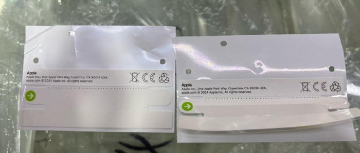 后封档口工作人员展示给记者苹果的原封封条和后封封条,左侧为原封,右侧为后封。右侧后封封条纸质更硬,字体颜色较深。新京报贝壳财经记者张晗 摄