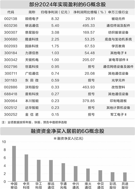 据证券时报·数据宝统计,6G概念股中,2024年实现盈利且经营同比向好的有15只。其中,移远通信、沃特股份、本川智能、天银机电、慈星股份实现净利润同比翻倍。