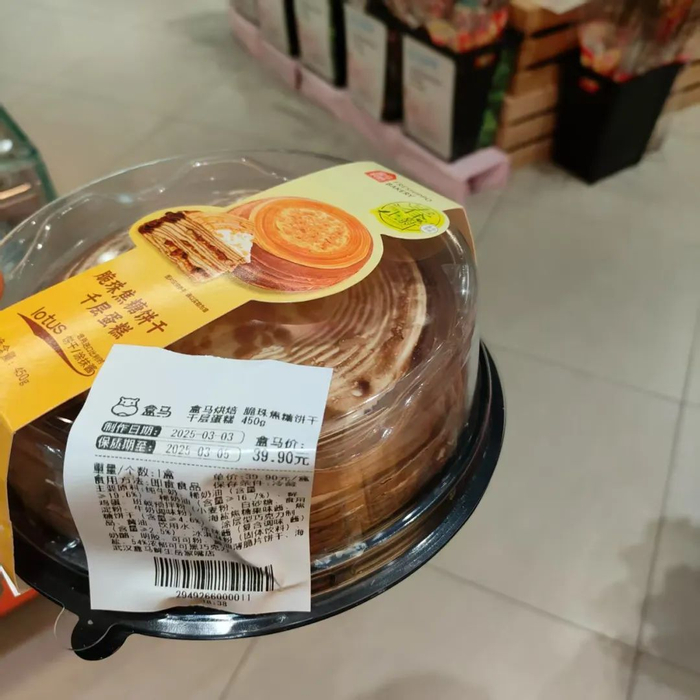 知情人士表示,盒马售价为59.9元某千层蛋糕出厂价不到40元,这包括贴牌、运输等,他们供应全国盒马门店的千层蛋糕。