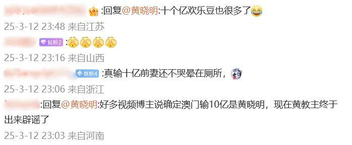 黄晓明回应后,大批网友留言“好多视频博主说澳门输10亿是黄晓明,终于出来辟谣了”“欢乐豆输十亿也挺离谱”。