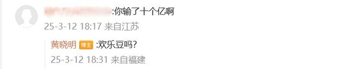 有网友在评论区留言“你输了十个亿啊”,黄晓明火速回复:“欢乐豆吗?”