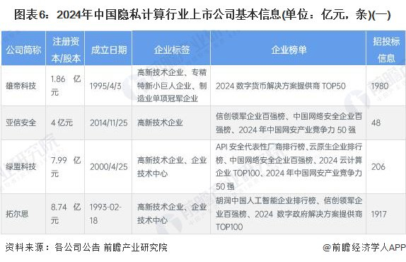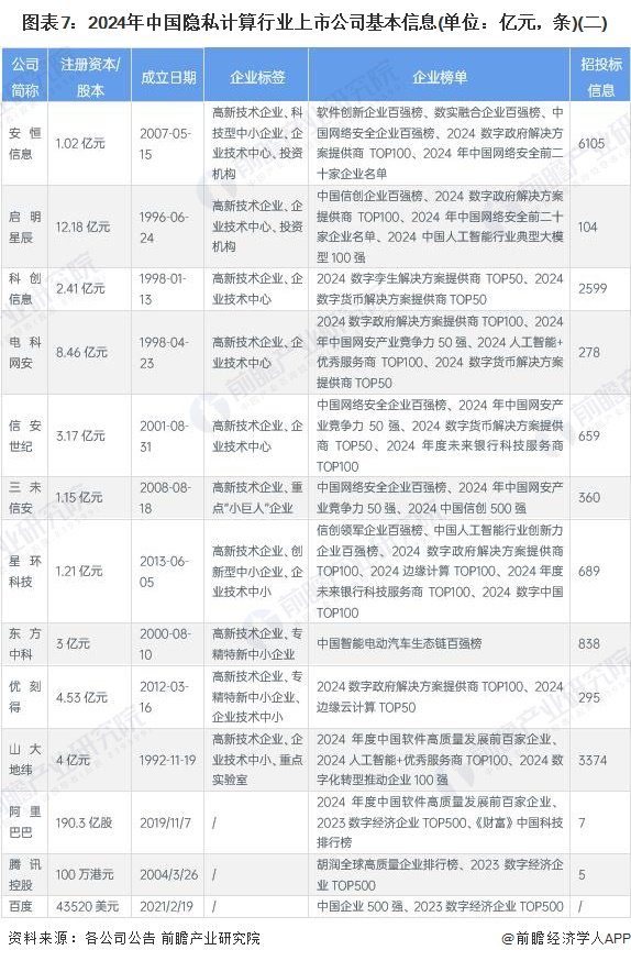 从隐私计算行业的上市企业布局和已有公开信息分析,注册资本最多的是腾讯控股,而成立时间最早的是山大地纬,招投标信息最多的则是安恒信息。
