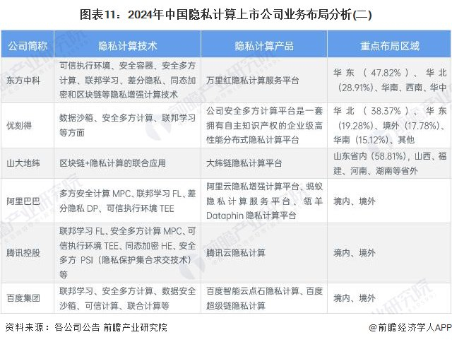 从上市公司业务布局看,隐私计算行业上市公司业务布局广泛,技术涵盖多方安全计算、联邦学习等,产品多样,重点布局区域各有侧重,部分公司如阿里巴巴、腾讯控股、百度集团等在全球范围内均有布局,而山大地纬则更侧重于山东省内及特定省外区域。各企业业务布局具体如下: